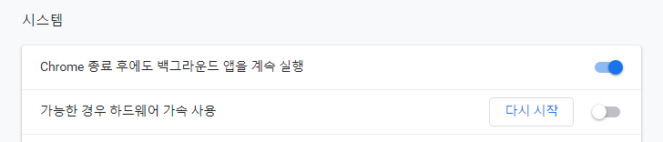 크롬 브라우저는 고급설정 시스템에서 하드웨어 가속 사용을 끄면 됩니다.