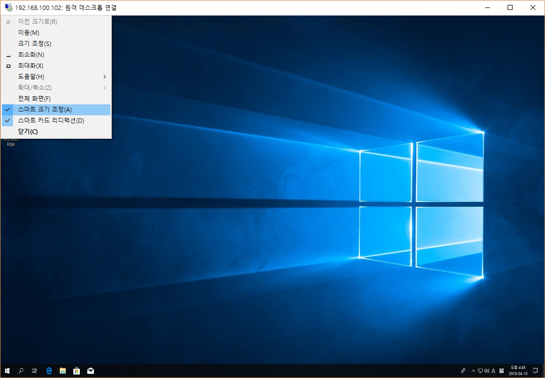 원격데스크톱연결에서 스마트 크기 조정 기능이 있는데 이를 체크하면 창에 화면이 꽉차게 할 수 있습니다.