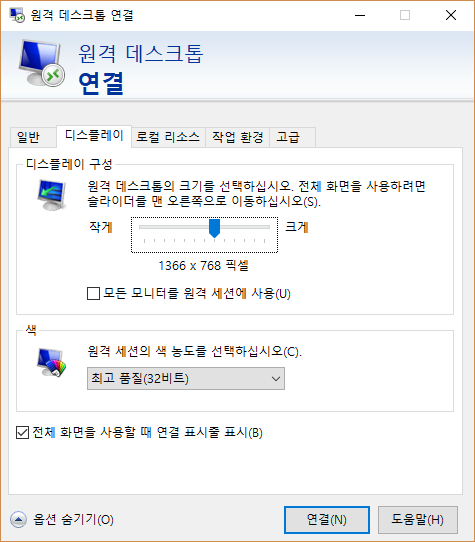 원격데스크톱 화면을 전체화면으로 사용하기엔 조금 부담스럽지요~