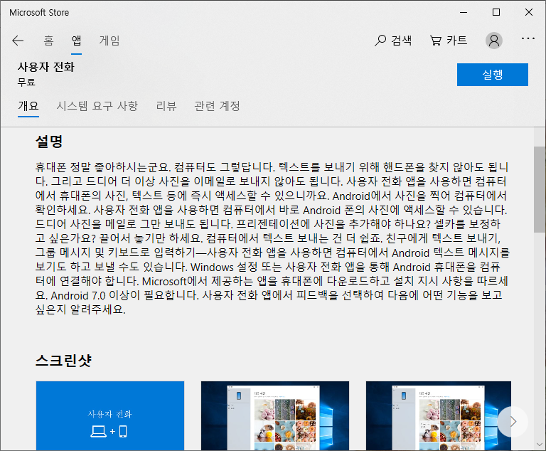 윈도우에서는 Microsoft Store 를 실행하고 앱에서 your phone 을 검색하고 설치하면 됩니다.