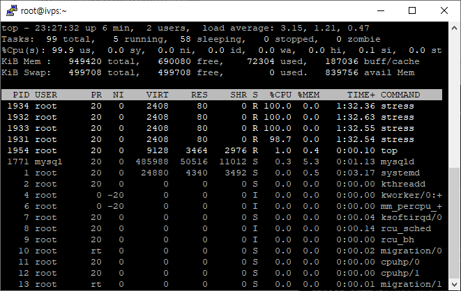 [root@ivps ~]# stress --cpu 8 --io 4 --vm 2 --vm-bytes 128M --timeout 10s