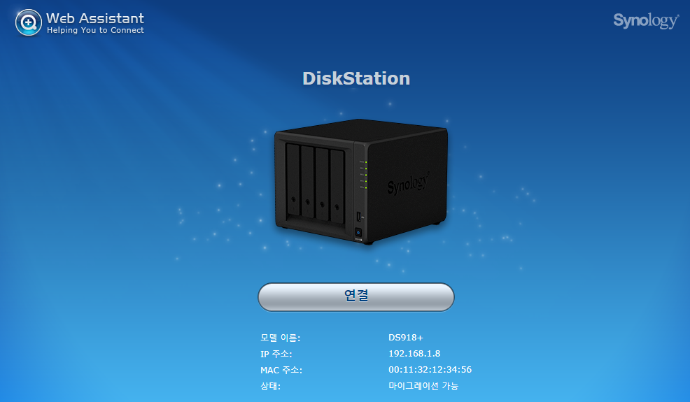 USB(저용량이라도 상관없음)로 부팅하고 일정 시간이 지난 후에 웹브라우저에서 find.synolog.com 입력 후 엔터