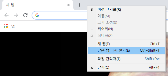 이럴때는 새 탭 우측 빈 공간에서 마우스 우측 버튼을 눌러서 "닫은 탭 다시열기" 를 눌러보세요~