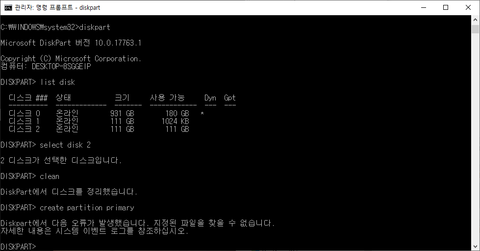 잘 사용하던 SSD 가 인식이 안되서 확인해보니 초기화도 안되고 Diskpart 명령어도 안먹히네요~