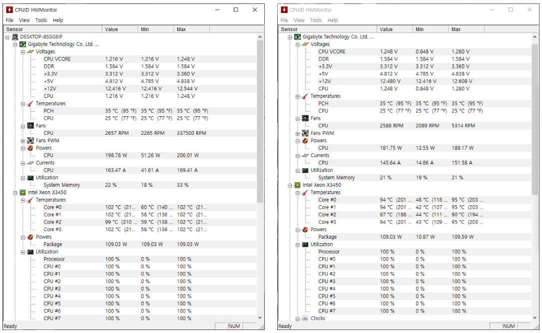부하테스트는 간단하게 CPU-Z 메뉴에서 Bench 탭에서 스트레스 테스트를 걸고 CPUID HWMonitor 를 실행했습니다.