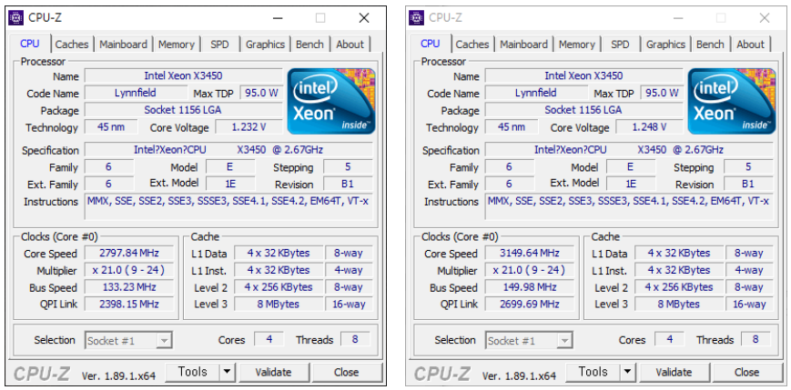 왼쪽은 BCLK 133 x Muliplier 21 = 2.8GHz, 오른쪽이 BCLK 150 x 21 = 3.15GHz 입니다.