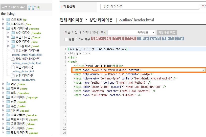 메타 태그 인증으로 선택하고 고도몰 관리자 페이지에서 디자인 -> 전체 레이아웃 -> 상단 레이아웃