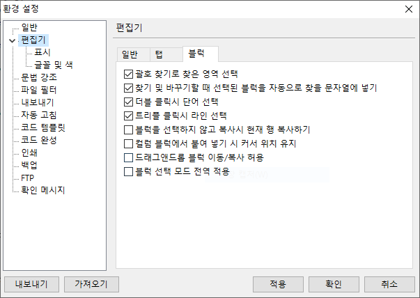 도구 -> 환경 설정 -> 편집기 -> 블럭 메뉴에서 아래와 같이 설정하고 적용하면 됩니다.