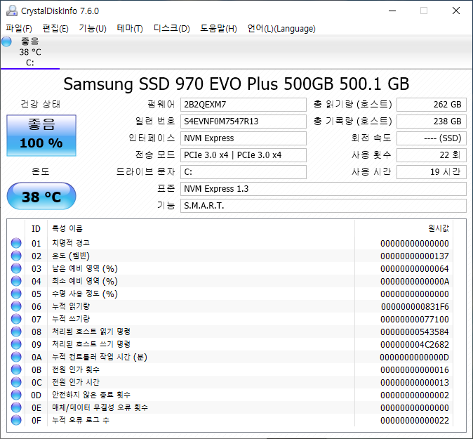 그리고 삼성 SSD EVO 970 Plus 500GB CrystalDiskInfo 와 CrystalDiskMark 도 첨부합니다.