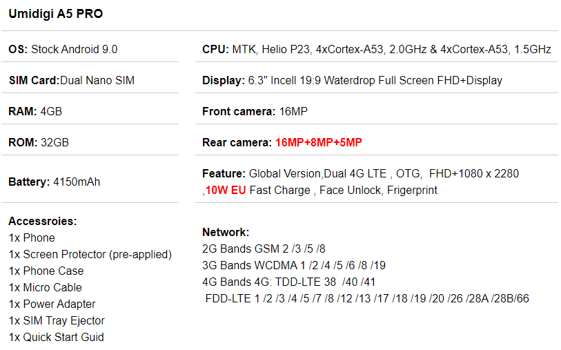 제조사의 스펙은 www.umidigi.com/page-umidigi_a5pro_specification.html 여기를 참고하세요~