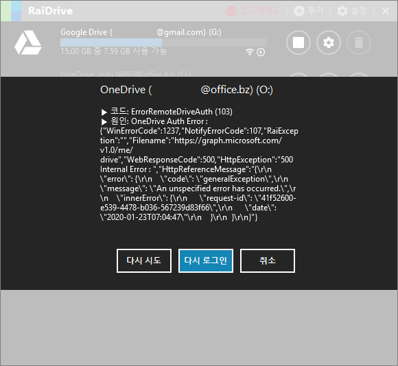 레이드라이브로 원드라이브를 네트워크 드라이브로 연결해서 잘 사용하고 있었는데 어느순간 접속에러가 나네요~